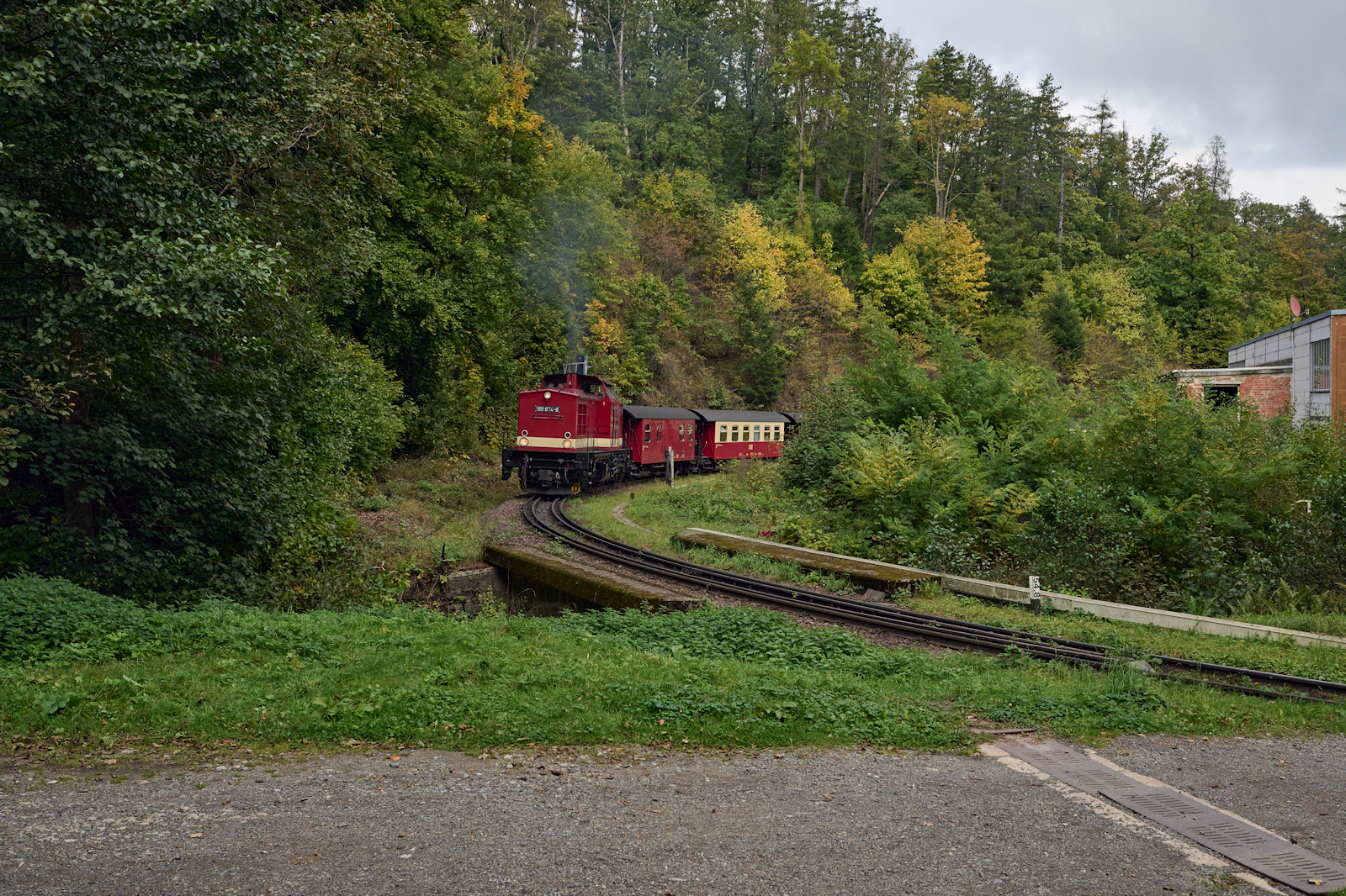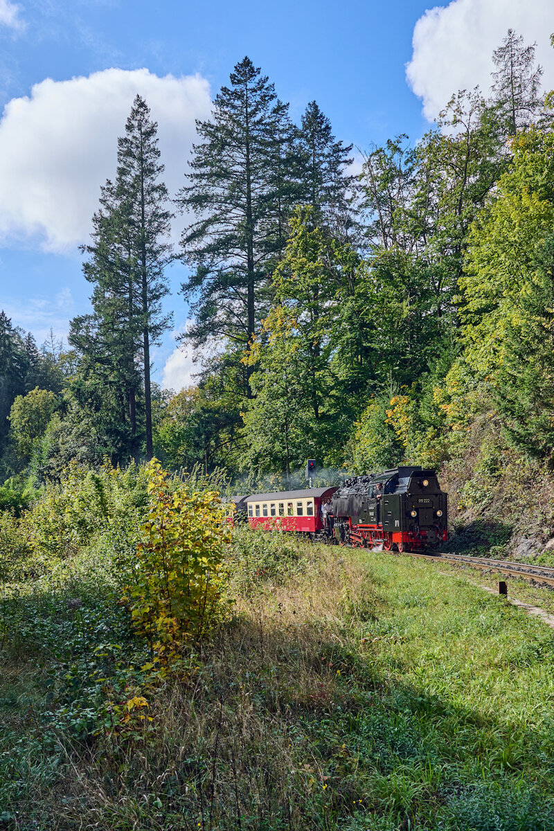 Einige Brockenzüge wurden 2024 mit Diesel bespannt. 199 874 zog am 05.10.2024 Zug 8935 von Wernigerode zum Brocken. Nach Durchfahren einer 180°-Kurve wird in Kürze der Bahnhof Steinerne Renne erreicht. Michael Brunsch