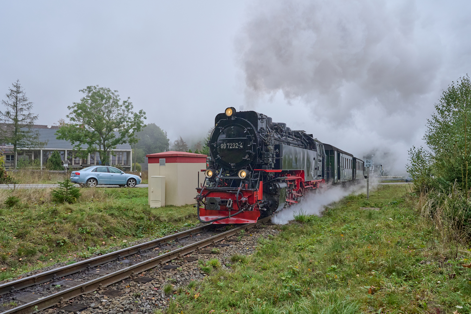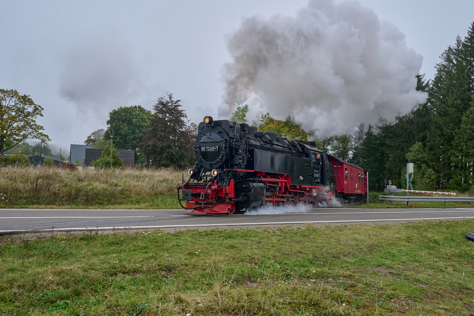 Am 05.10.2024 war der Traditionszug der Harzer Schmalspurbahnen auf dem Weg von Wernigerode zum Brocken. Da keine der Mallets betriebsfähig ist, musste mit 99 7232 auf eine der Neubauloks aus den 1950er Jahren zurückgegriffen werden, die auch im Regelbetrieb verkehren. Bei Drei Annen kreuzte der Zug im Nebel die L100. Michael Brunsch
