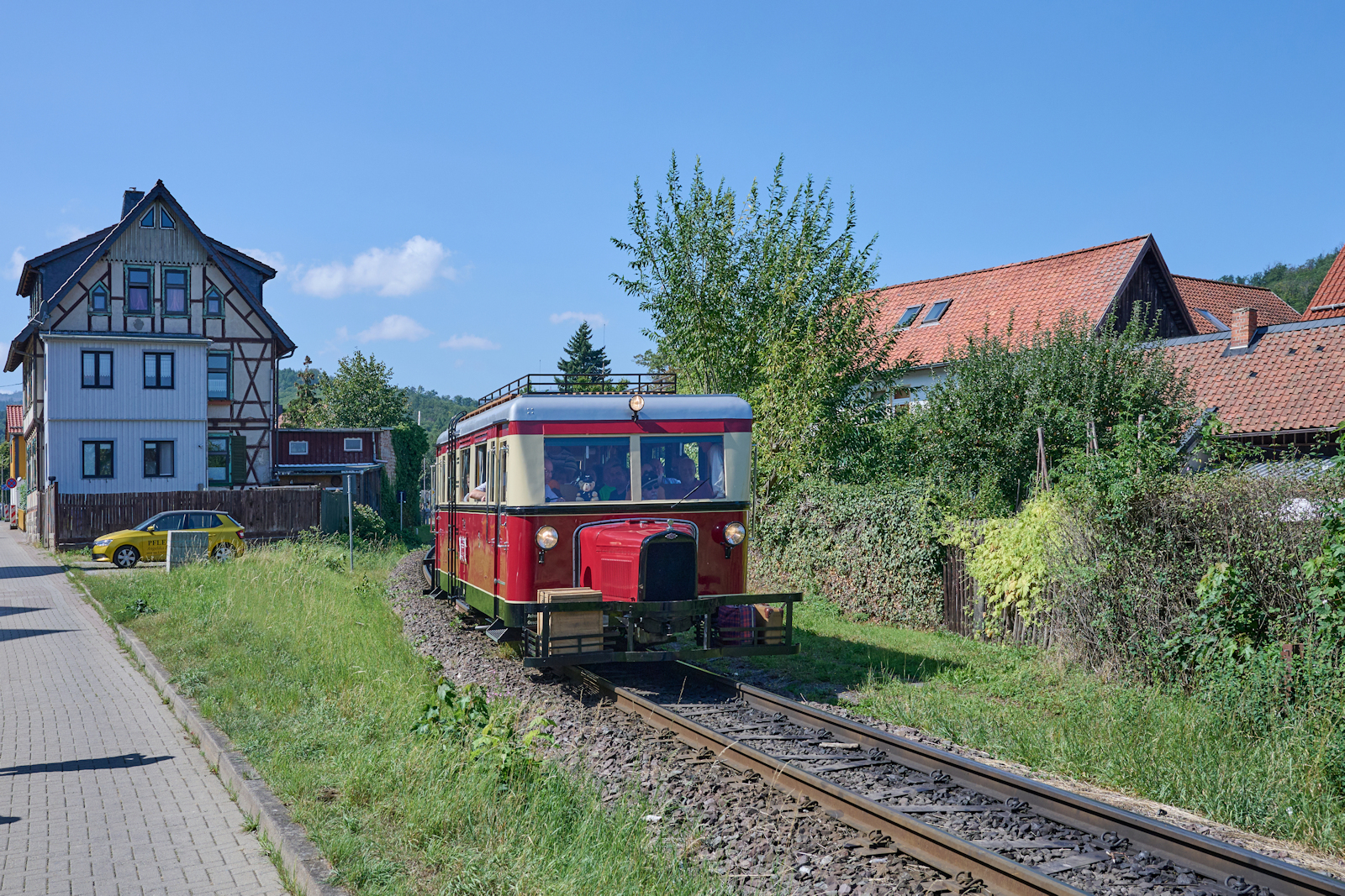 Am 24.08. und 25.08.2024 weilte T41 des DEV zum 125. Geburtstag der Harzquerbahn in Wernigerode. Zwischen Wernigerode Hbf. und Hasserode wurden Pendelfahrten durchgeführt. Entlang der Triangel in Hasserode war der Triebwagen am Vormittag des 24.08. auf dem Weg von Hasserode nach Wernigerode Hbf. Michael Brunsch