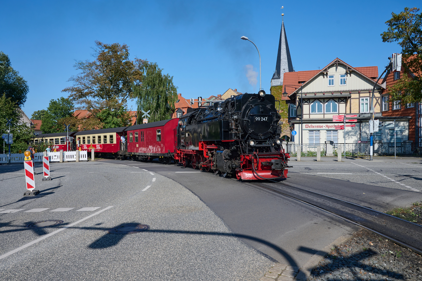 Völlig unerwartet kam 99 247 am Nachmittag des 24.08.2024 mit einem Zug aus Richtung Wernigerode Hbf. Gerade wird die Westerntor-Kreuzung überquert. Michael Brunsch