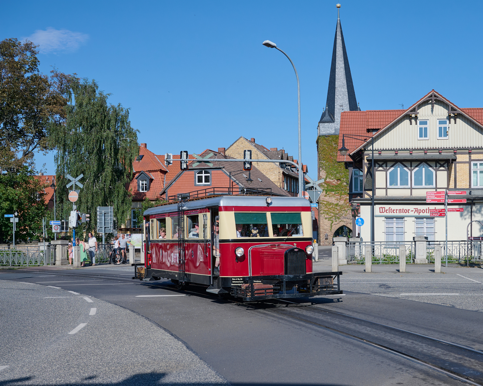 Zum 125. Geburtstag der Harzquerbahn war der T41 des DEV in Wernigerode zu Gast. Im Rahmen von Pendelfahrten fuhr der Triebwagen am 24.08.2024 von Wernigerode Hbf. und Hasserode und querte die Westerntorkreuzung. Michael Brunsch