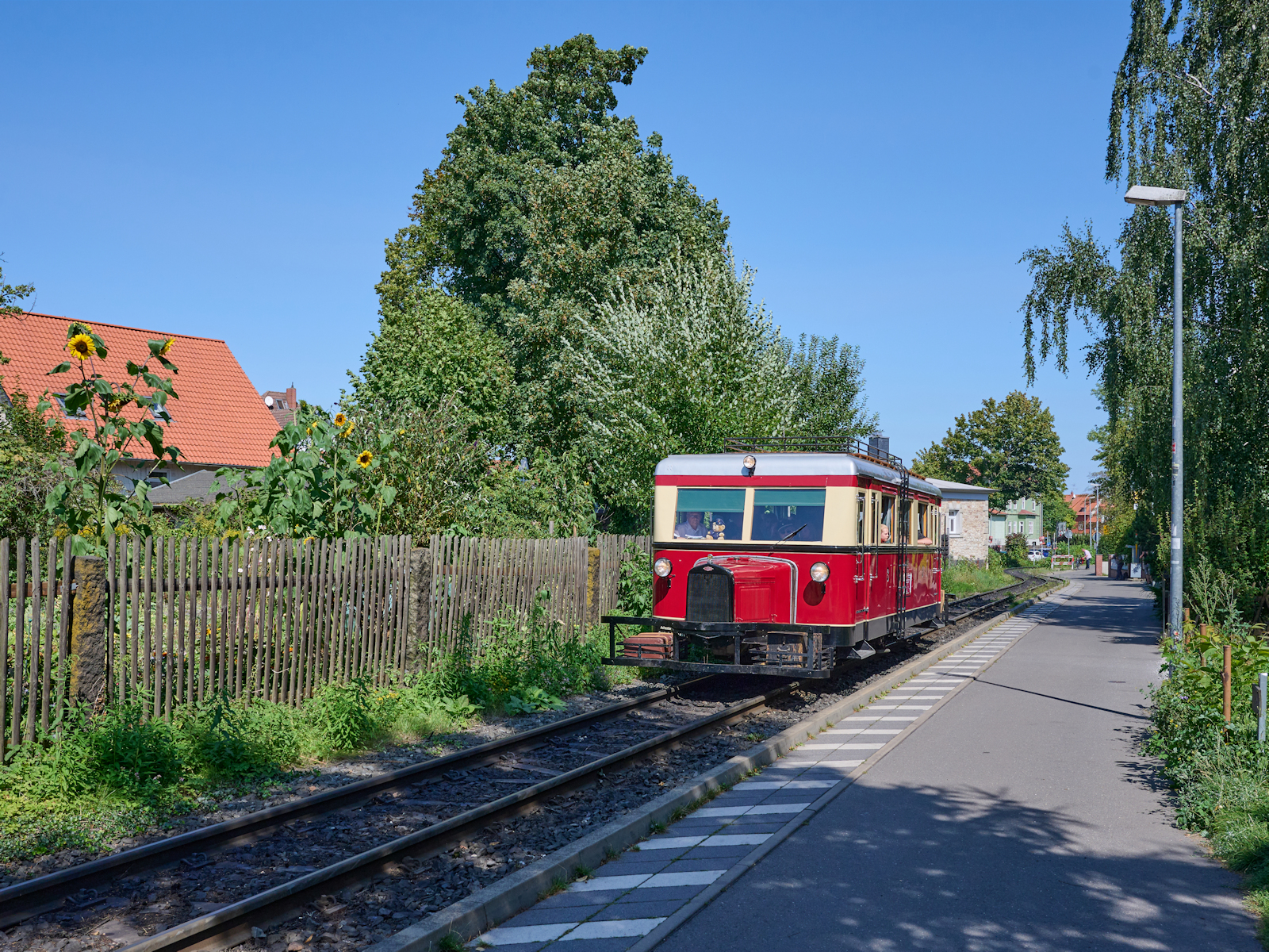 Zum 125. Geburtstag war der Triebwagen 41 des Deutschen Eisenbahnvereines zu Gast im Harz. Am 24. und 25.08.2024 wurden Pendelfahrten in Wernigerode durchgeführt. Kurz hinter der Westerntorkreuzung fuhr der Triebwagen am Mittag des 24.08.2024 in Richtung Hasserode. Michael Brunsch