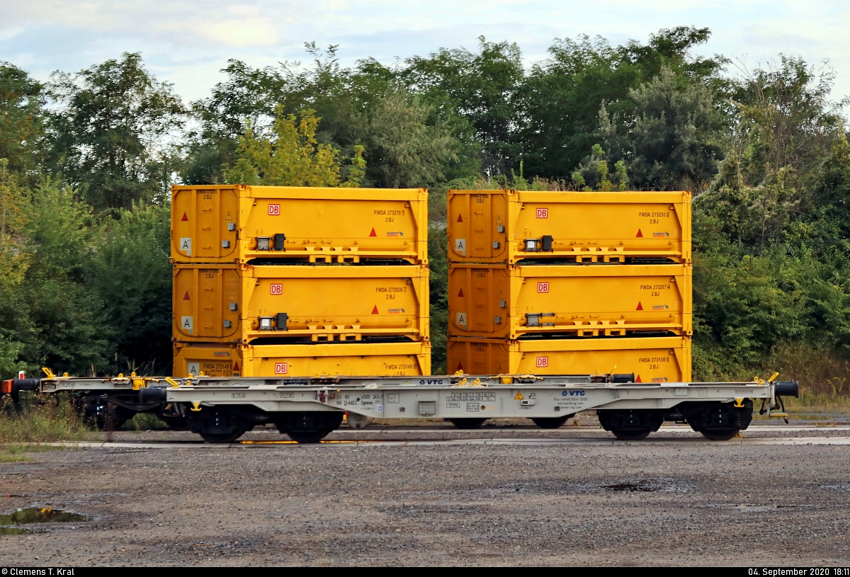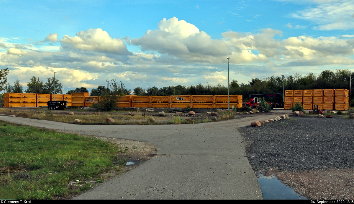 Auf dem Gelände der Romonta GmbH in Amsdorf, Hersteller von Montanwachs und Betreiber des hiesigen Braunkohletagebaus, sind zahlreiche Schmitz Cargobull Abraumcontainer von "Stuttgart 21" und dazugehörige Containertragwagen der Gattung "Sgmmns 212" abgestellt.