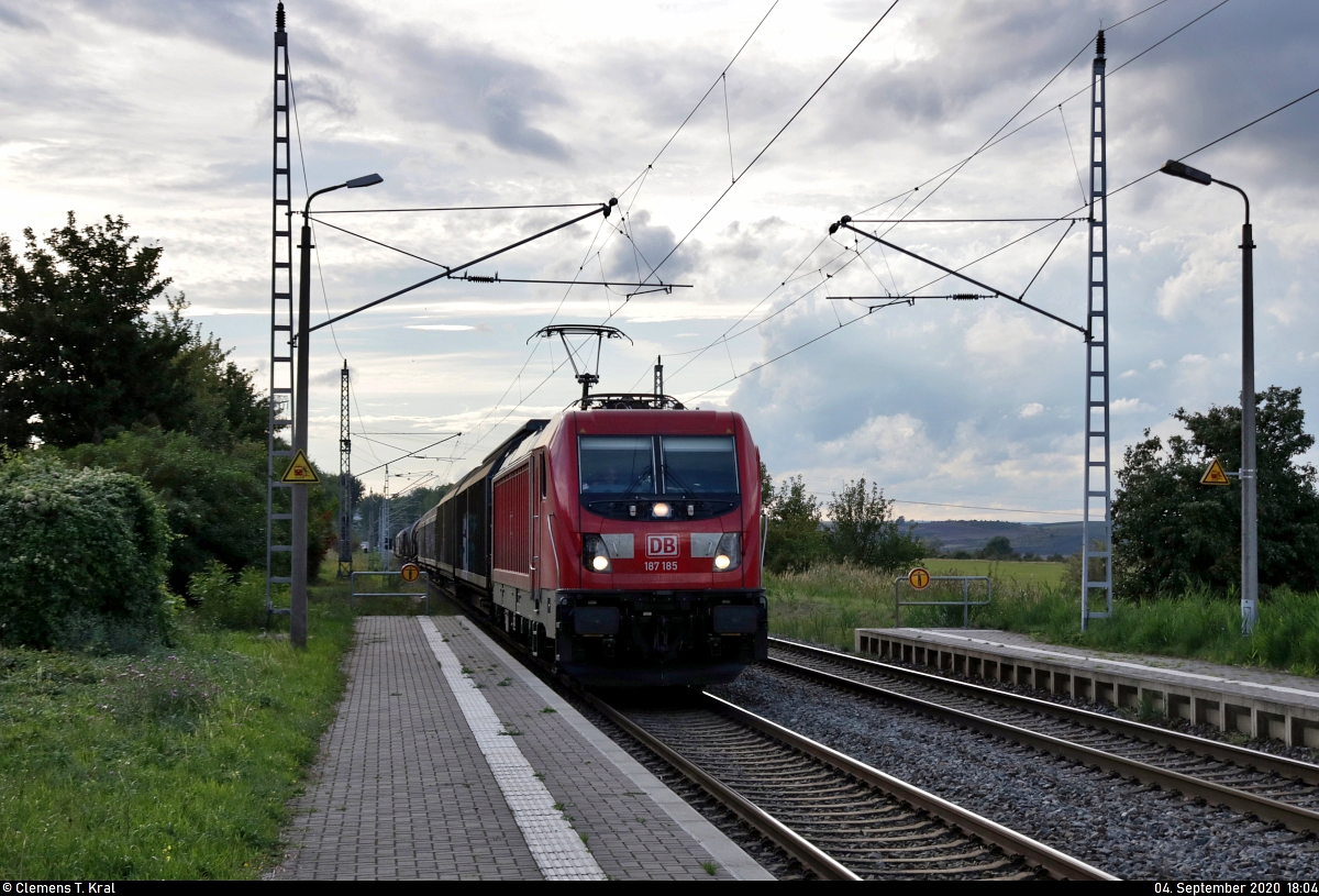 Gemischter Gz mit 187 185-4 durchfährt den Hp Amsdorf auf Gleis 1 Richtung Teutschenthal.