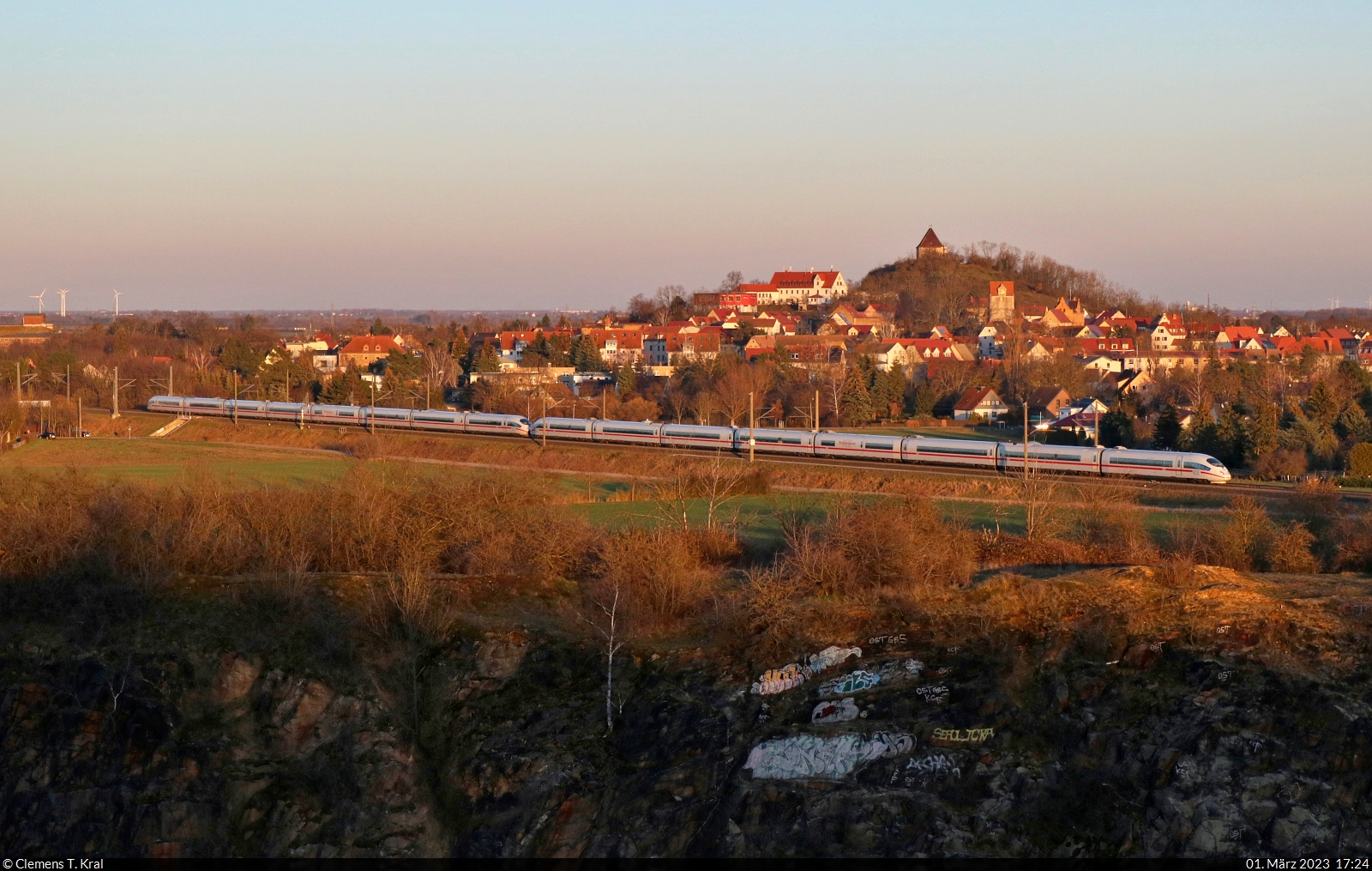 Am späten Nachmittag dieses sonnigen ersten Märztages wurde vom Gützer Berg bei Landsberg (Saalekreis) einem 412 Richtung Bitterfeld hinterhergeblickt, der allerdings völlig außerhalb der gewöhnlichen ICE-Fahrzeiten unterwegs war.