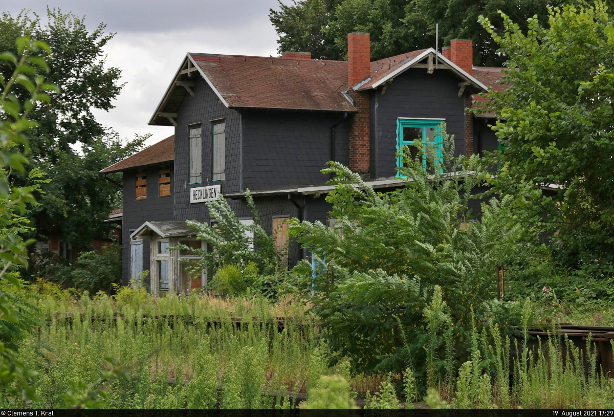 Der Bahnhof Hecklingen bzw. das, was von ihm noch übrig ist. Der Personenverkehr wurde auf dem Streckenabschnitt von Staßfurt nach Egeln im Jahr 2002 eingestellt, zwischen Egeln und Blumenberg bereits 1999. Heute betreibt die A.V.G. Ascherslebener Verkehrsgesellschaft mbH die Strecke und stellt dort vorrangig alte Güterwagen ab. Aufnahme vom Bahnübergang Staßfurter Straße. 🚩 Bahnstrecke Staßfurt–Blumenberg (KBS 317) 🕓 19.8.2021 | 17:26 Uhr