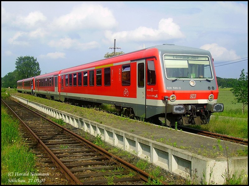 RE26813 Lutherstadt Wittenberg-Leipzig Hbf beim Halt in Söllichau am 27.05.07. Zu Pfingsten reaktivierte die Elbe Saale Bahn den Streckenabschnitt Bad Schmiedeberg - Eilenburg vorübergehend und setzte drei Zugpaare zusätzlich auf der Heidebahn für Pfingstausflügler ein. Von Söllichau aus kann man z.B. leicht die Bunkeranlagen von Kossa besuchen. Harald Neumann