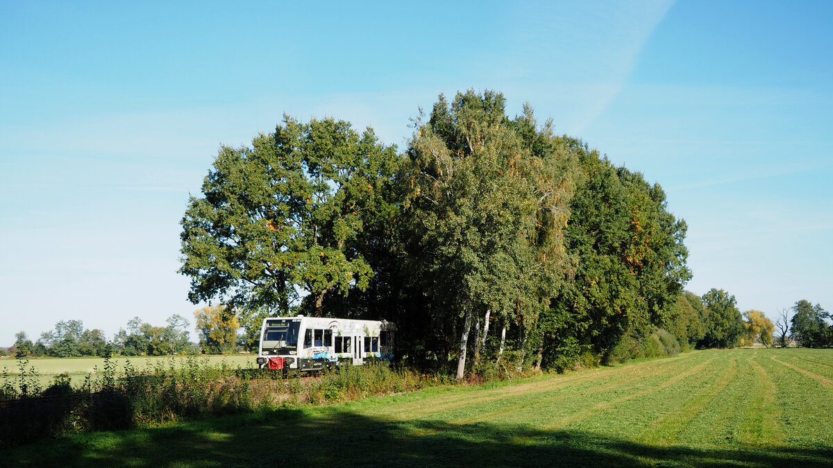 672 913 (DWE 27783) ist kurz nach Verlassen des Startbahnhofs Wörlitz auf dem Weg nach Oranienbaum und passiert in Kürze den BÜ zum örtlichen Klärwerk. Oranienbaum, der 09.10.2022