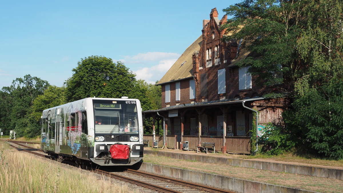 672 915 als DWE 27763 fährt nach kurzem Aufenthalt am (verrammelten und unbesetzten) Bahnhof Oranienbaum weiter, um dem Ziel Dessau Hbf entgegen zu streben.