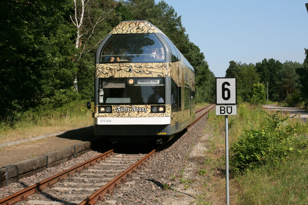 DWE 670 004  Fürst Franz  als 81188  Wörlitz - Dessau Hbf, aufgenommen am Haltepunkt Biosphärenreservat.