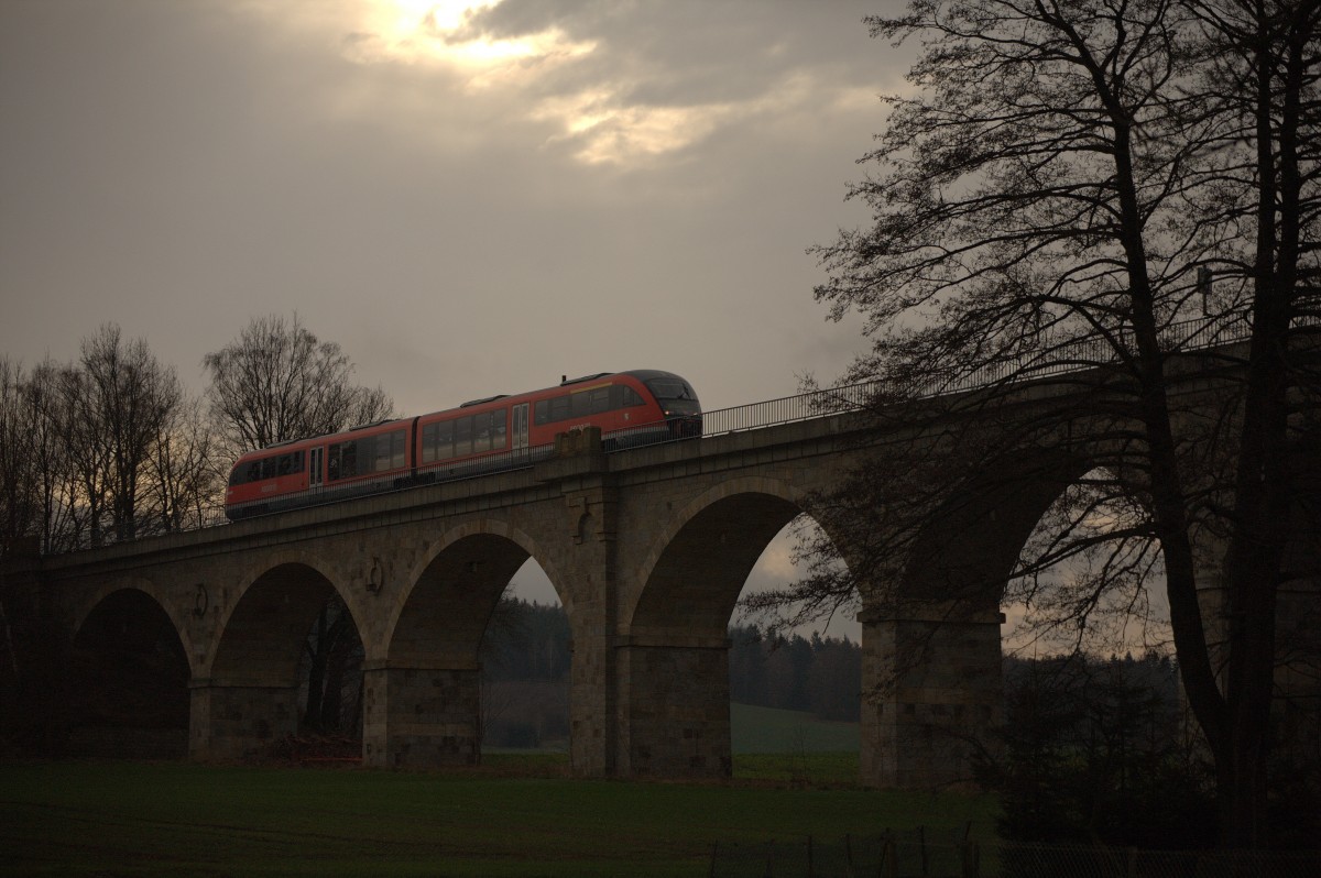 Detailansicht des Putzkauer Viadukts an der Strecke Wilthen - Bischofswerda . Ein TW der Baureihe 642 passiert gerade Richtung Bischofswerda. Siegfried Heße