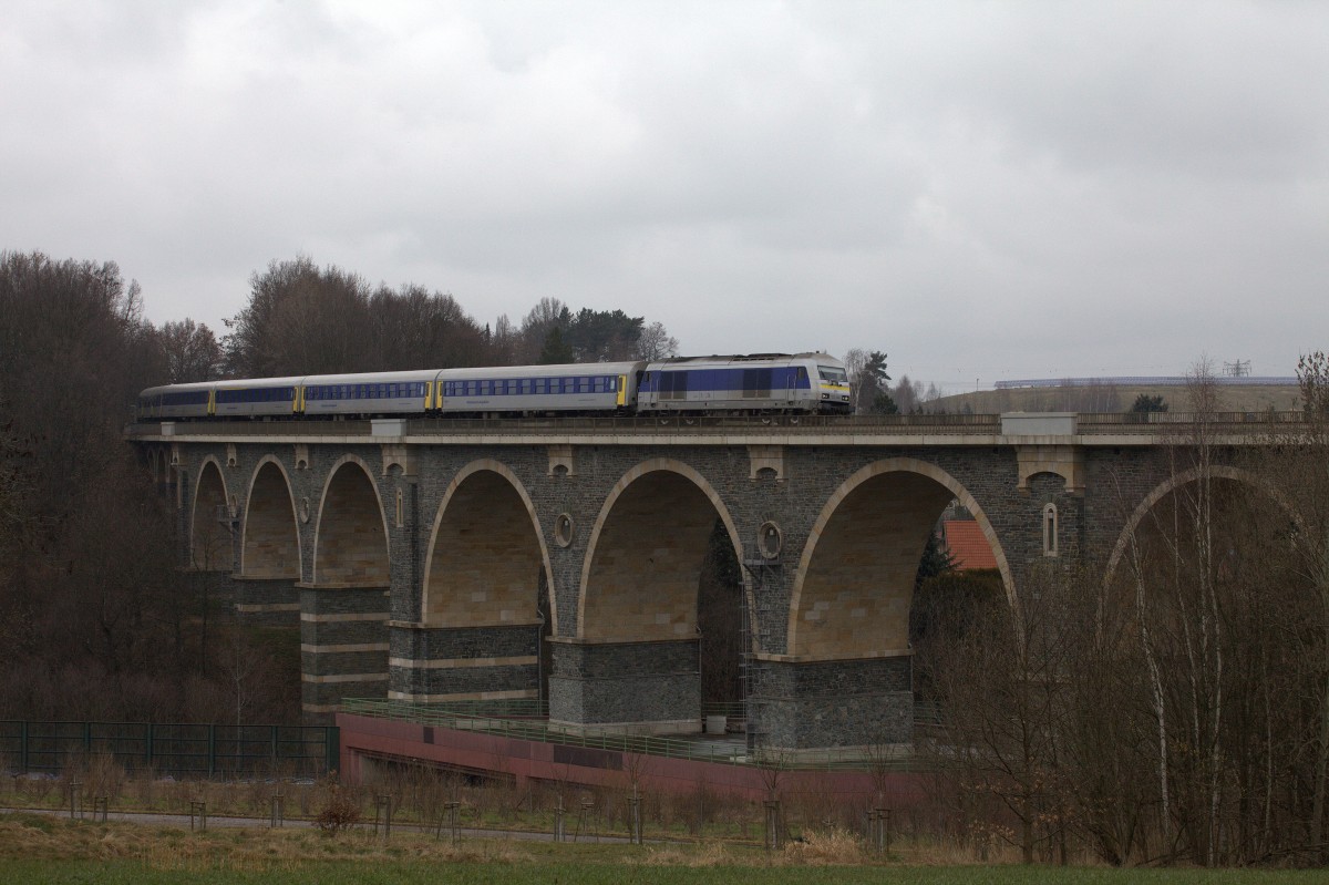 RE 6 aus Leipzig, geführt von 233 144 der MRB , auf der Fahrt nach Chmenitz, überquert das bekannte Viadukt über den Bahrebach bei Chemnitz Borna. 19.03.2016 13:16 Uhr.