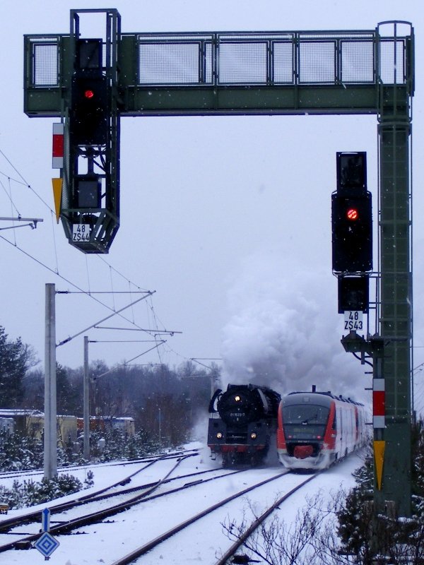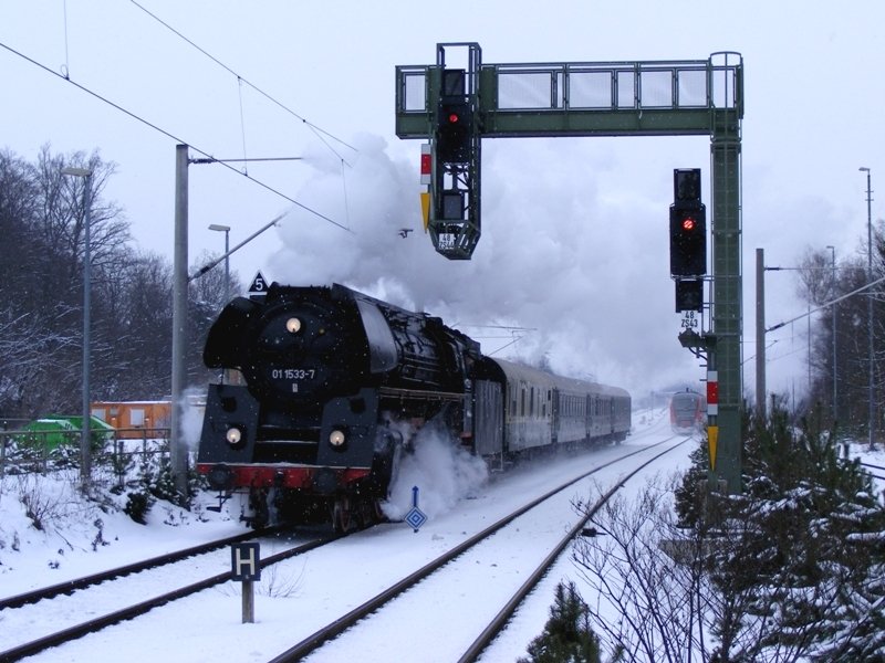 18 201 verlässt unter Volldampf das Elbtal, mit einem Sonderzug nach Görlitz im Zuge des Dampfloktreffens 2009. Aufgenommen am 22.03.2009 im Bahnhof Dresden-Klotzsche. Thomas Müller