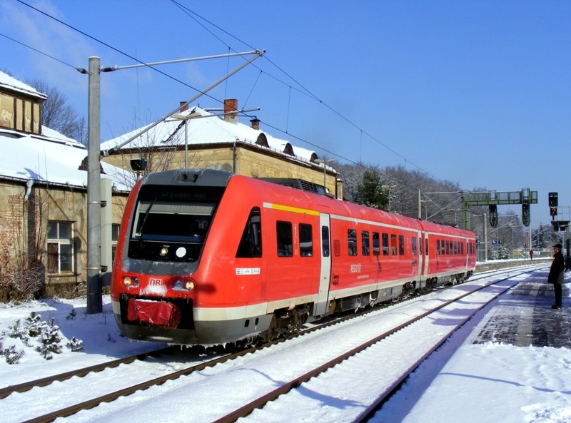 143 828-2 ist mit der S-2 in Dresden-Flughafen angekommen und fährt nach kurzen Aufenthalt zurück nach Pirna. Aufgenommen am 13.2.2009. Christopher Pätz