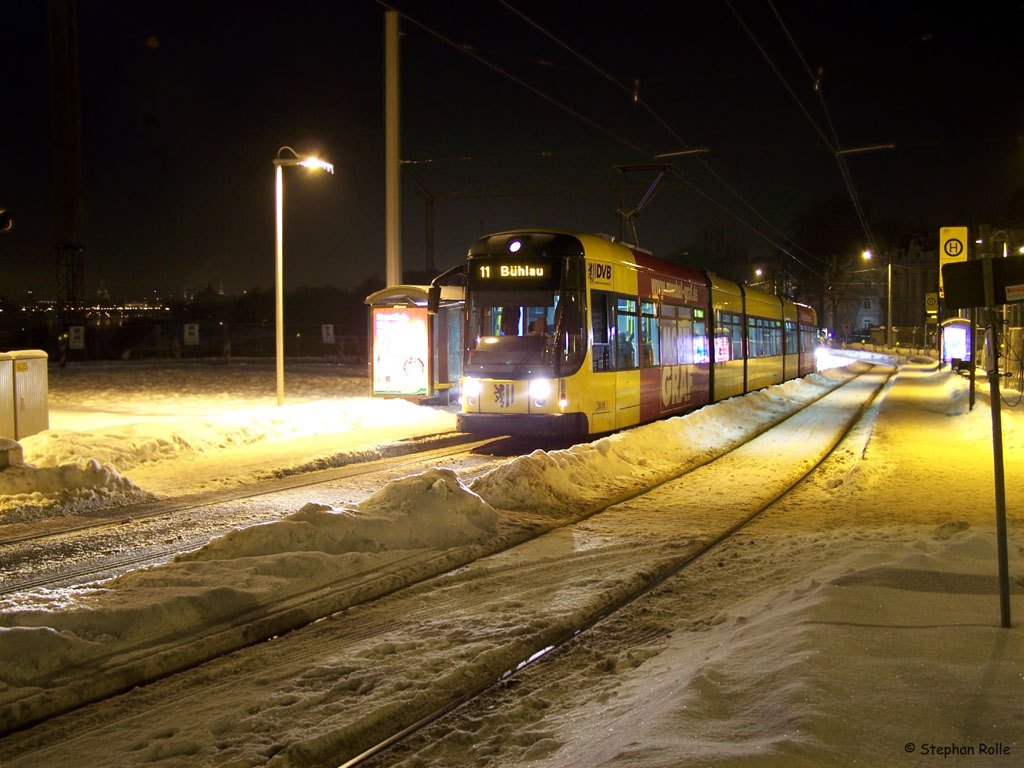 Der provisorische Endpunkt für die Linie 11 (Zschertnitz-Bühlau) ist seit mehreren Monaten Dresden-Nordstraße. Dort wird die Waldschlösschenbrücke gebaut. Das Gleis endet mitten auf der Straße und die Zweitrichtungswagen wechseln das Gleis über eine eingebaute Weiche, um zurück zu fahren. 10.09.09