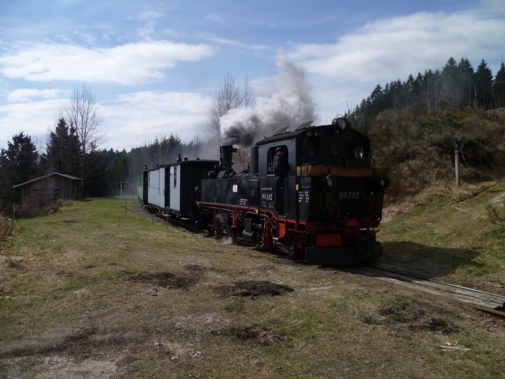 Osterdampf in Schönheide am 09.04.12 mit 99 582. Hier zwischen Neuheide und Stützengrün.