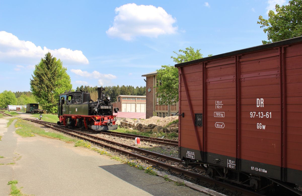 Am 29.04.18 ging es zur Museumsbahn Schönheide, denn es gab zwei Besonderheiten. Die 99 516 war mit ihrer EDV-Nummer „99 1516-6“ beschildert und Sie fuhren mit der Lok vorran bis Neulehn. Hier ist der Zug in Neulehn zu sehen.