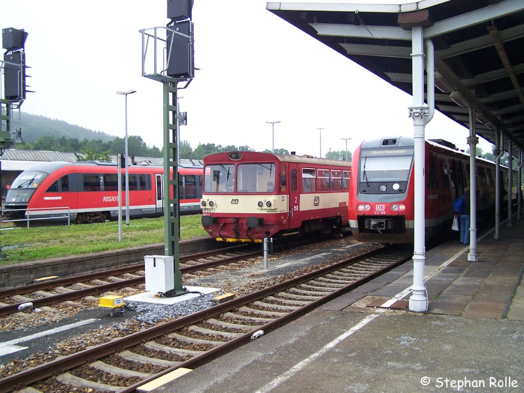 Auf Grund von Bauarbeiten auf der KBS 235 war die Strecke am 27./28.06.2009 zwischen Wilthen und Ebersbach(Sachs) gesperrt. In Ebersbach(Sachs) warten daher auf Abfahrt von rechts nach links 612 108-1 als RE2 nach Liberec(Reichenberg), 810 643-7 als Os 6641 nach Rumburk und 642 149-9 als RB61 nach Zittau. Stephan Rolle