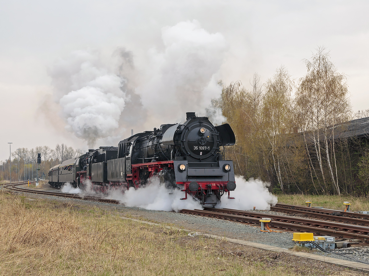 Die Dampflokomotiven 35 1097-1 und 50 3610-8 mit Sonderzug bei Ausfahrt aus den Bahnhof Ebersbach in Richtung Bischofswerda am 14. April 2019 Dmitry Mamin