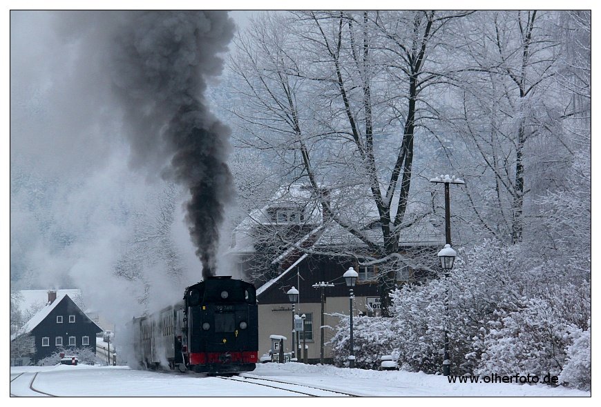 Dampflok 99 760 (Lok-Nr. weiß eingerahmt) (DR EDV-Nummer 99 1760-0; DB 099 733-8) der Zittauer Schmalspurbahn mit dem Personenzug SOE 314 bei Einfahrt in Bahnhof Kurort Jonsdorf; 08.06.2020