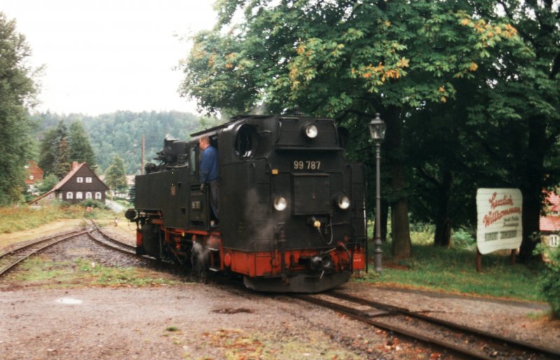 Gleich nach dem Ankuppeln wird Dampflok 99 760 (sächs. VII K alt) (DR EDV-Nummer 99 1760-0; DB 099 733-8) der Zittauer Schmalspurbahn Tender voraus die Rückfahrt als SOE 315 antreten; Kurort Jonsdorf, 08.06.2020