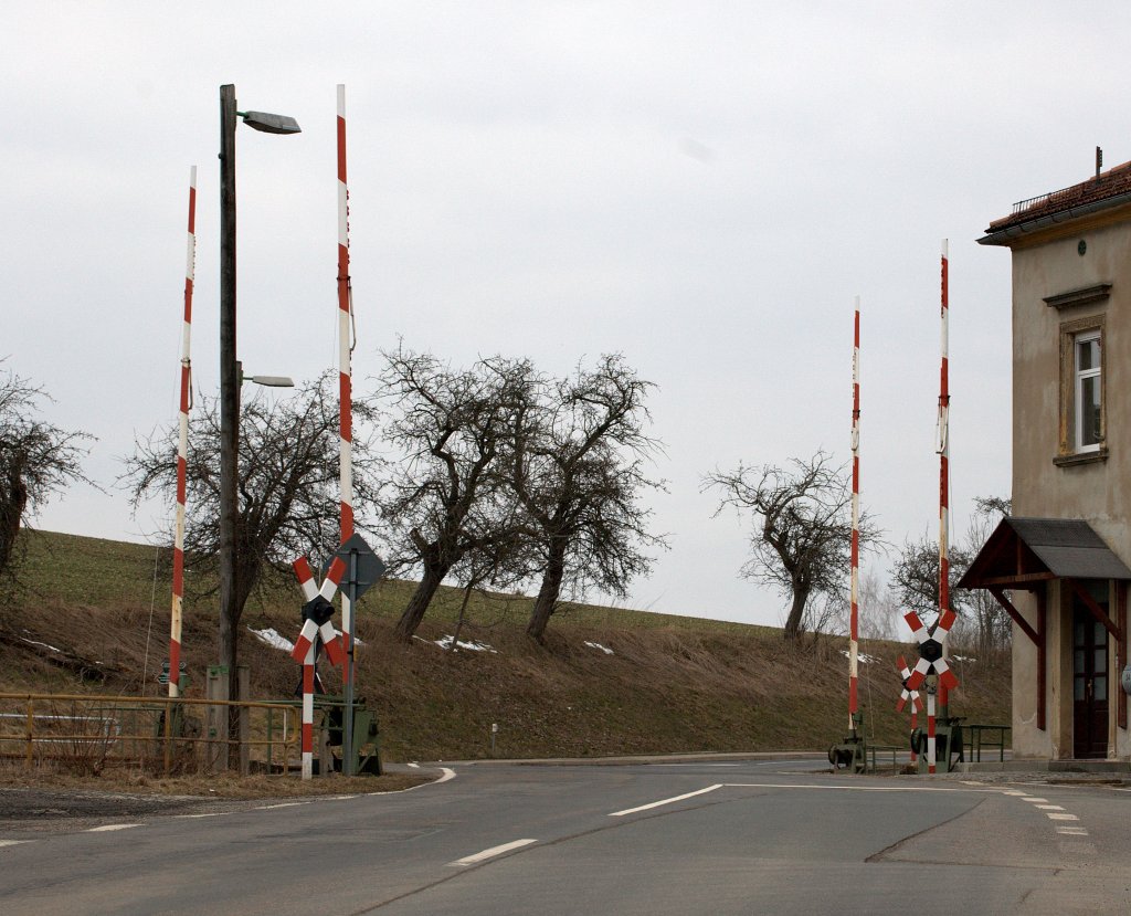 Seit über 30 Jahren sichern diese Warnkreuze mit Blinklicht den Bahnübergang im Triebischtal an der Strecke Meißen-Nossen.