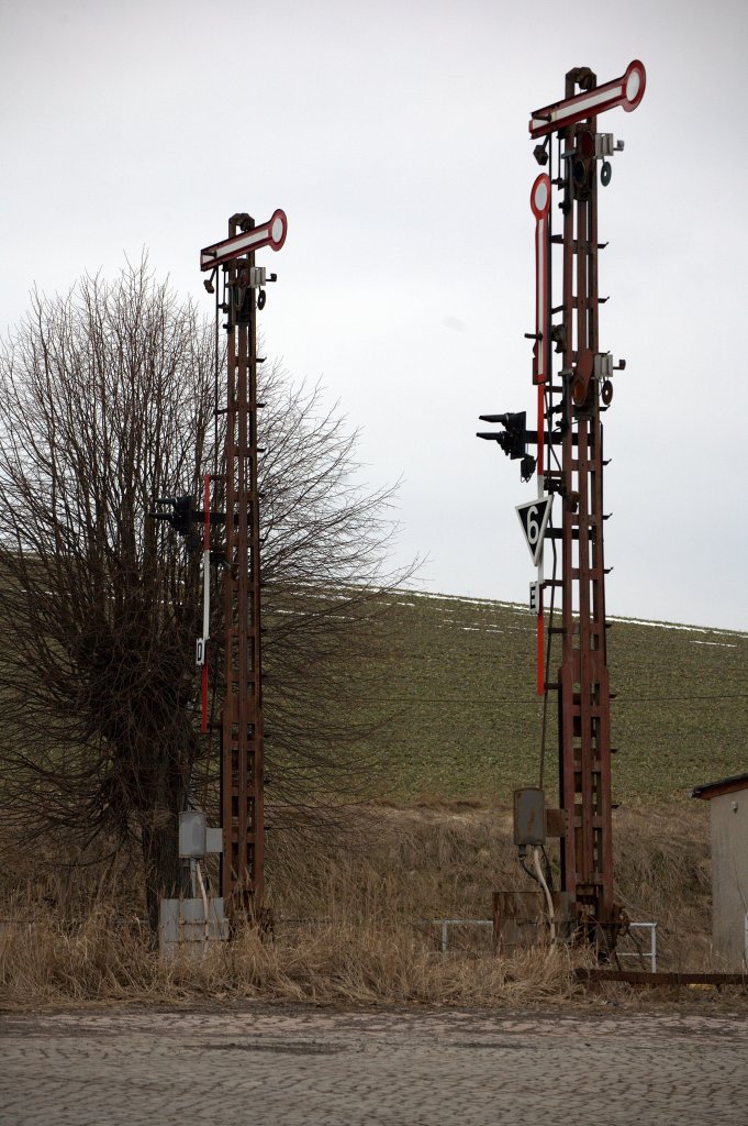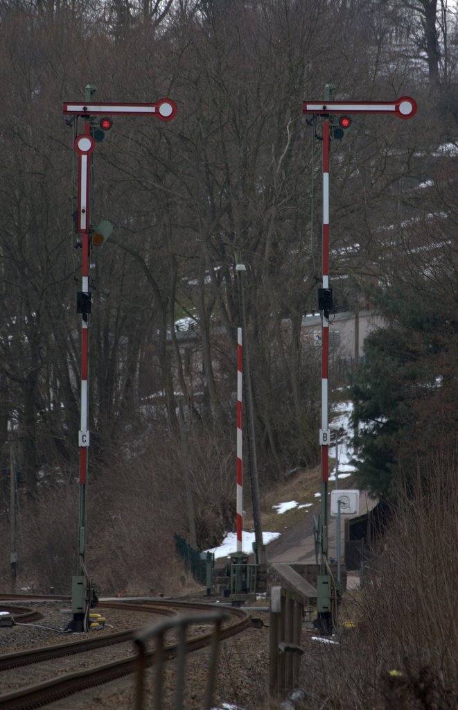 Typische Formsignale der moderneren Bauart finden sich als Signal C und B in Miltitz-Roitzschen Ausfahrt Richtung Nossen. 01.04.2013 17:29 Uhr Siegfried Heße