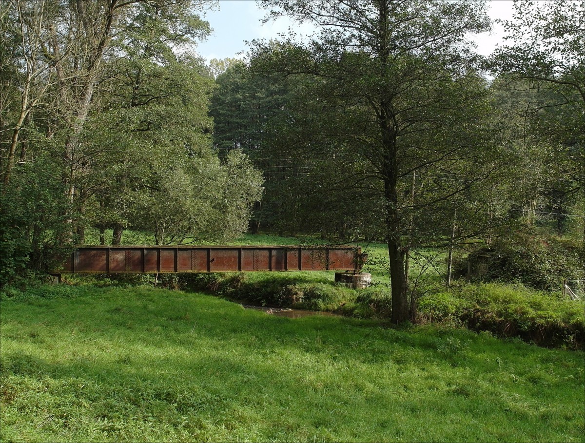 Brücke über die kleine Triebisch zwischen Taubenheim und Polenz bei km 10,8 der ehemaligen Strecke Wilsdruff - Meißen-Triebischtal. Hier fuhr der letzte Zug 1969; Foto vom 01.10.2014