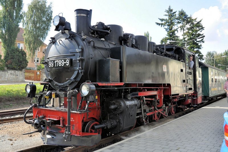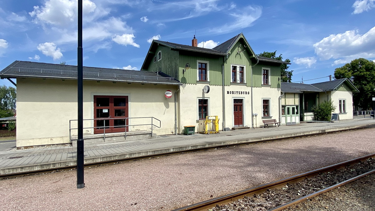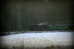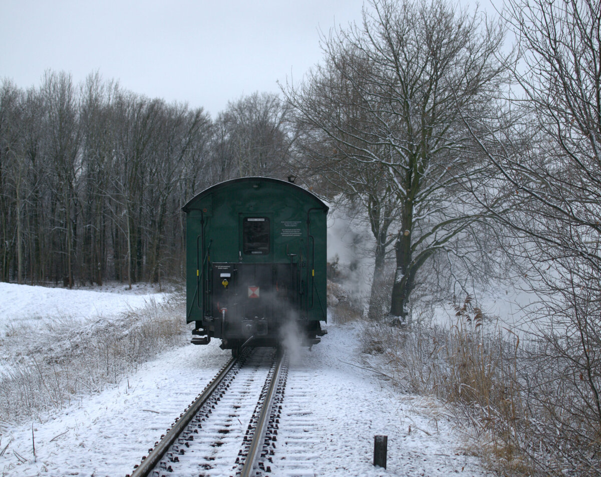 99 1761 - 8 hat gerade eben Moritzburg verlassen und fährt in einer leichten Steigung Richtung Dippelsdorfer Teich. Der Brechpunkt liegt kurz vor dem Teich, dieser liegt einige Meter höher als Schloß, Bahnhof und die Gemeinde Moritzburg.