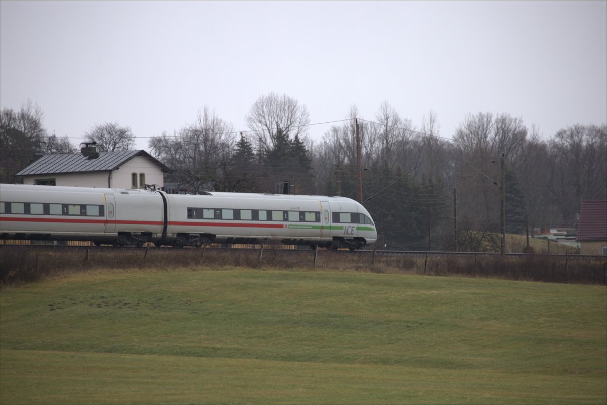 Ein "geshifteter " ICT auf dem Wege nach Dresden, trübes Winterniesselregenwetter an der Oberauer Kurve.Der Fluchtpunkt befindet sich am Masten linkes, Km. 20.2 . 09.01.2021, 11:18 Uhr. Teleaufnahme. Siegfried Heße