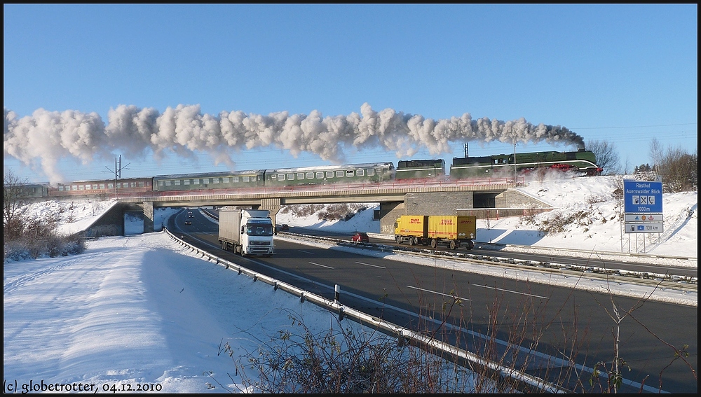 18 201 zieht am 04.12.2010 einen Sonderzug von Chemnitz nach Görlitz, hier überquert er in voller Fahrt die Autobahn A4 bei Oberlichtenau.