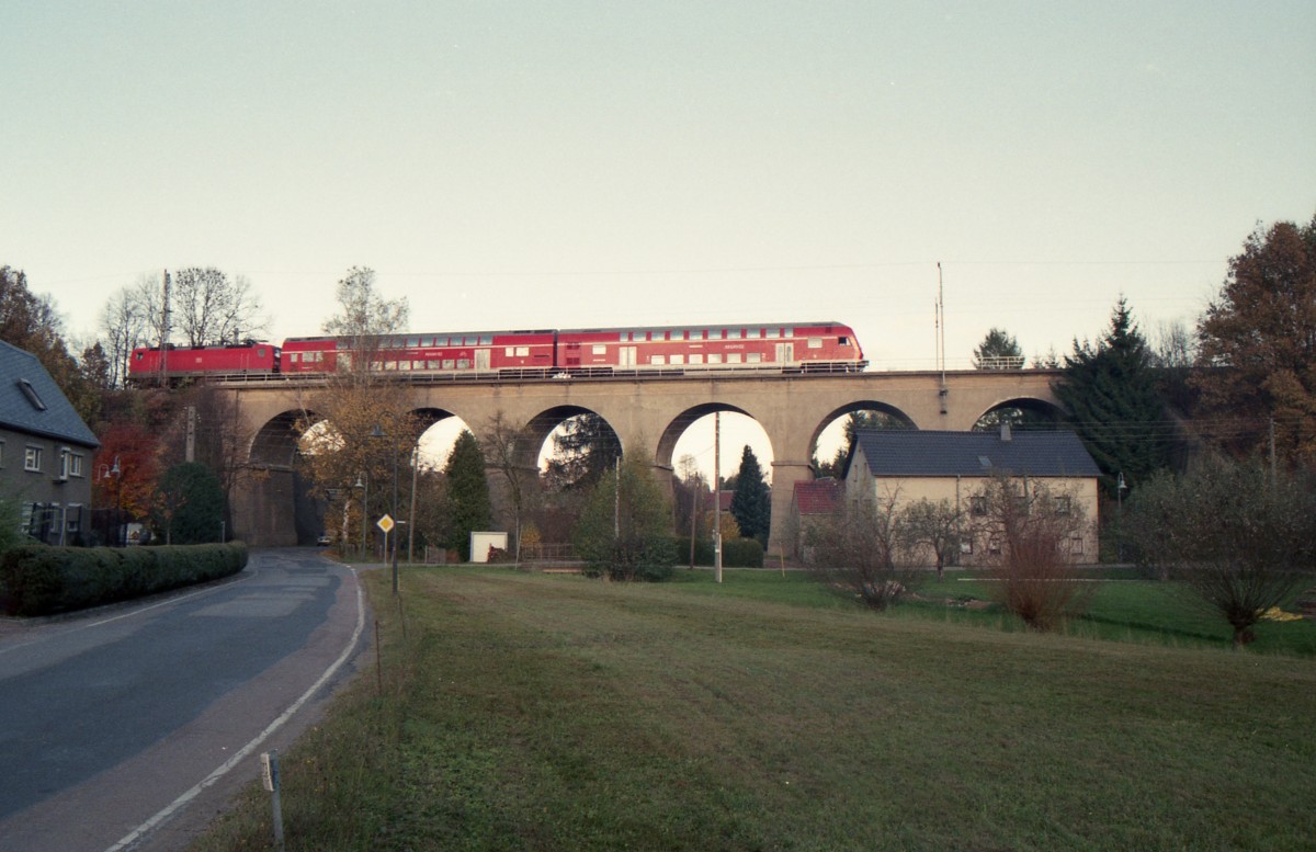In Ottendorf bei Mittweida befindet sich dieses alte Viadukt, das in den nächsten Jahren durch eine pfeilerlose Stahlträgerbrücke ersetzt werden soll. Am 24.10.2013 fuhr eine unbekannte 143 mit RB 17173 von Elsterwerda nach Chemnitz über die alte Brücke.