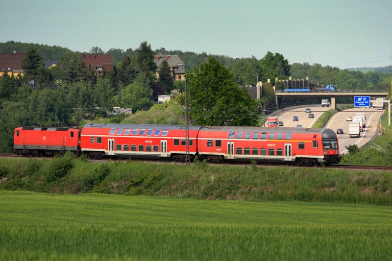 RB 17513 überquert die Bundesautobahn 4 kurz hinter Oberlichtenau, welches im Hintergrund zu erkennen ist, 13.05.09