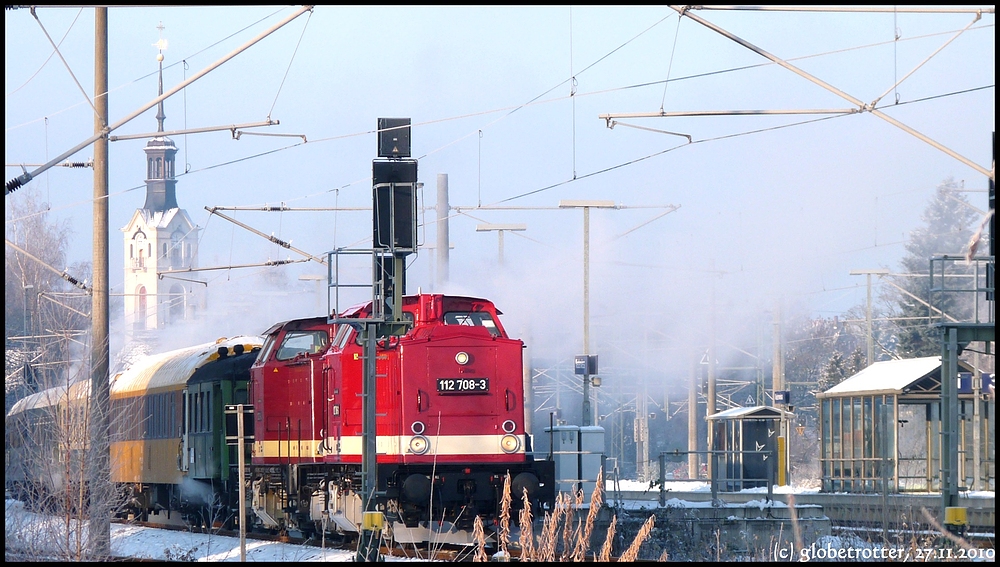 Abfahrbereit in eisig klarer Morgenluft des 27.11.2010: ein Doppelgespann mit 112 708 und 112 331 übernehmen in Niederwiesa einen Sonderzug durch das Zschopautal hinauf ins Erzgebirge. Heinz-Ulrich Löwe