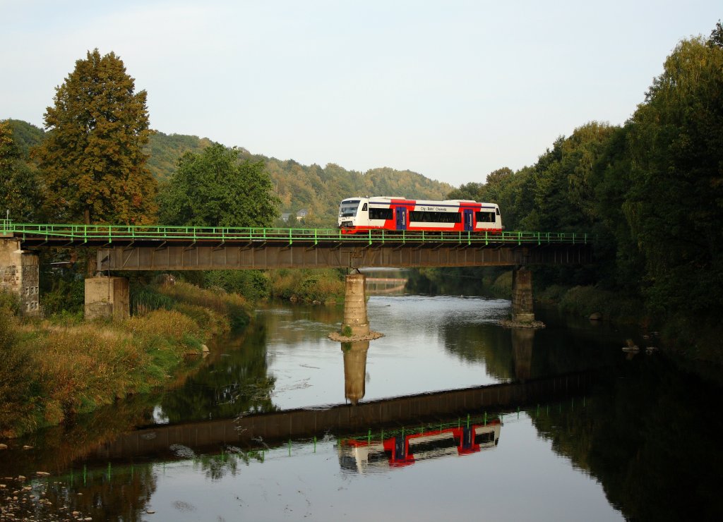 VT 515 der City Bahn Chemnitz überquert als CB 82526 auf dem Weg von Chemnitz nach Hainichen die Zschopau zwischen den Halten in Niederwiesa und Braunsdorf-Lichtenwalde. 22.09.09 Björn G. Dietrich