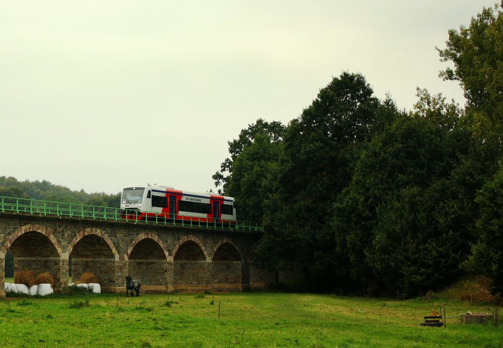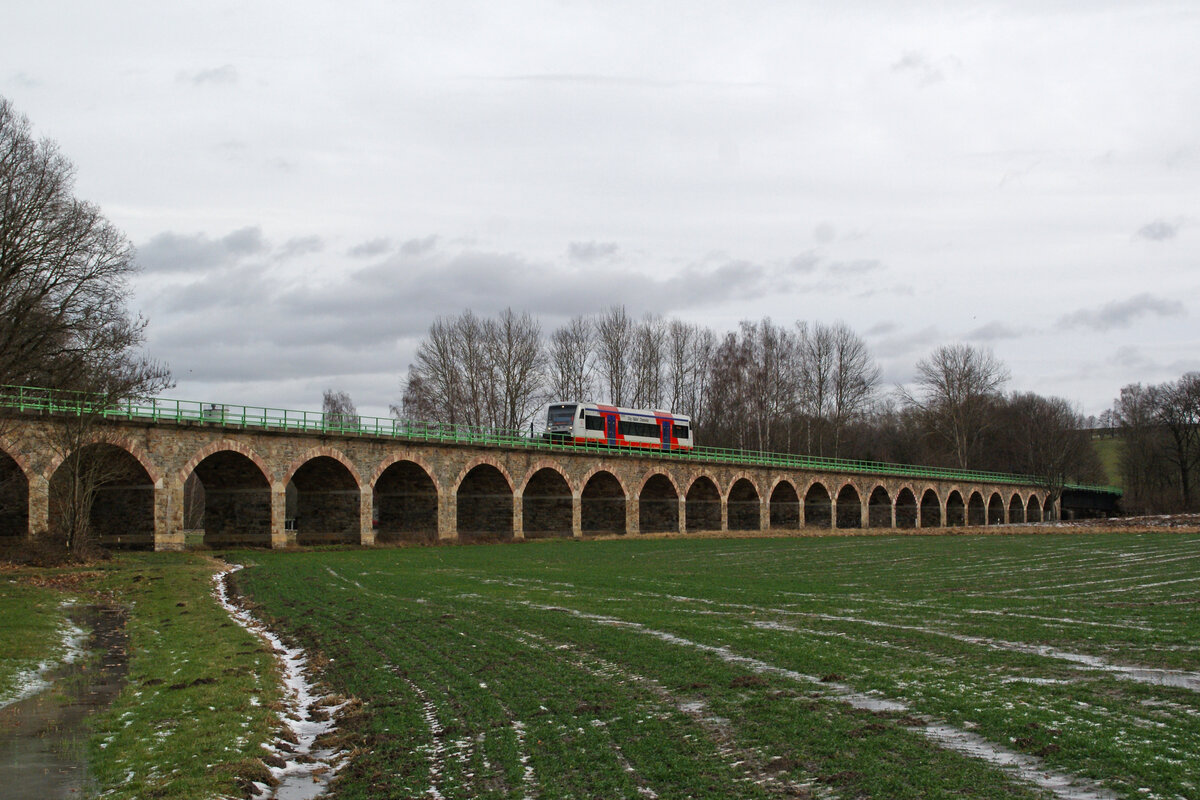 Zwischen den Halten in Braunsdorf-Lichtenwalde und Niederwiesa überqueren die RegioShuttle der City Bahn Chemnitz, wie hier VT 515 als CB 82523, Hainichen-Chemnitz Hbf, 3 sehenswerte Viadukte, wie hier den Viadukt Braunsdorf. 17.09.09 Björn G. Dietrich