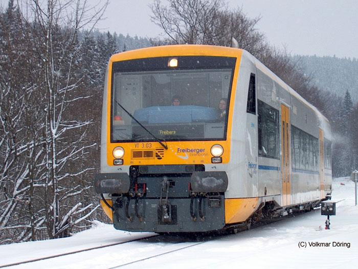 RegioShuttle VT3.03  Esther  der  Freiberger Muldentalbahn  in Holzhau bei Ausfahrt nach Freiberg (31.01.2003)