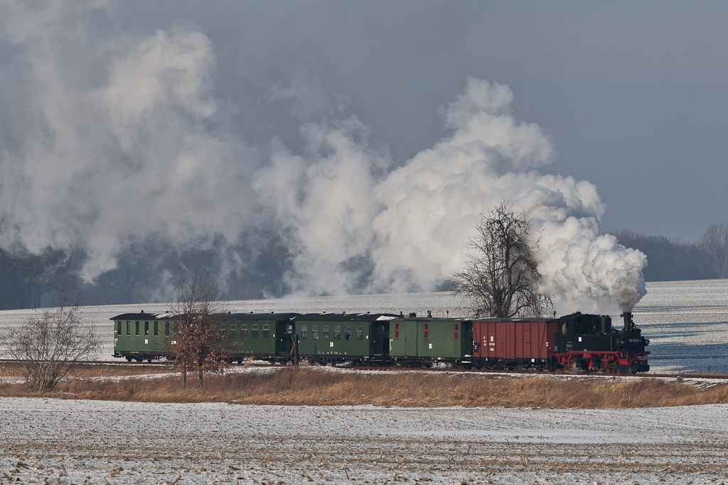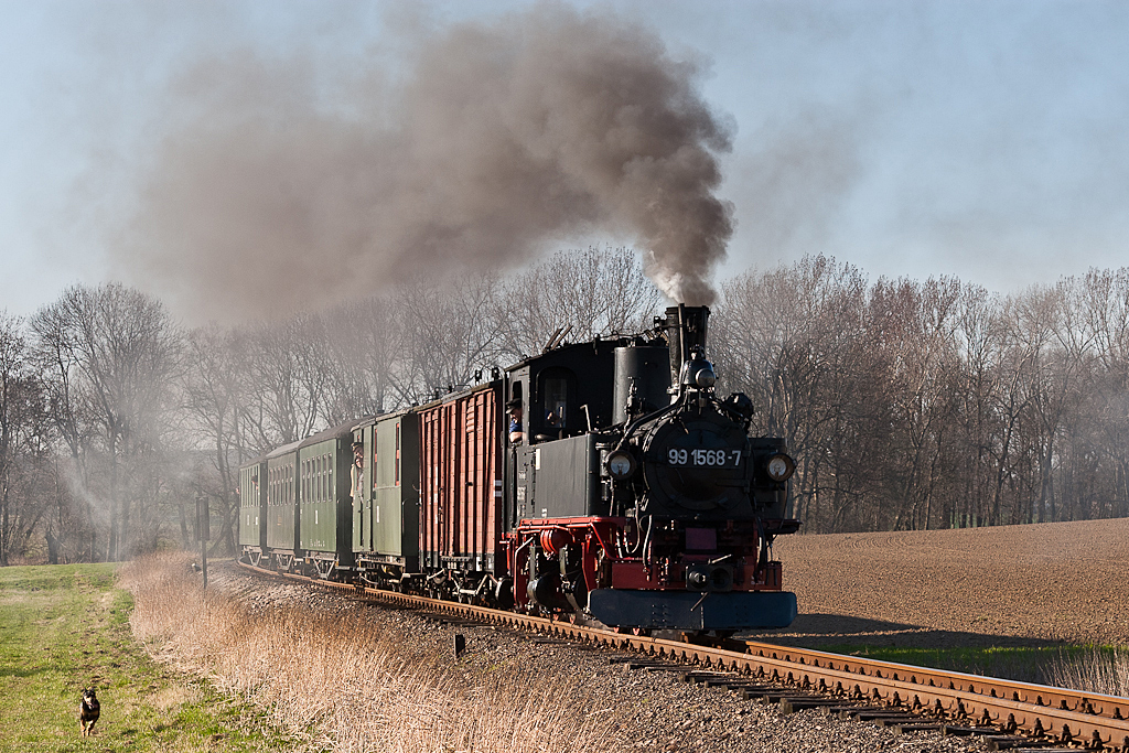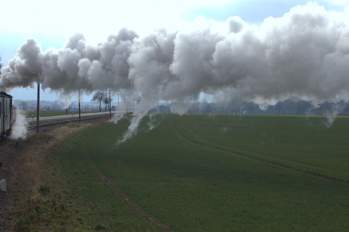 Am 21.05.2022 zogen 99 1584 und 99 1568 einen Güterzug mit Personenbeförderung von Oschatz nach Mügeln. Hier befand sich der Zug, der außerdem auch Rollwagen beförderte, kurz vor Naundorf. Michael Brunsch