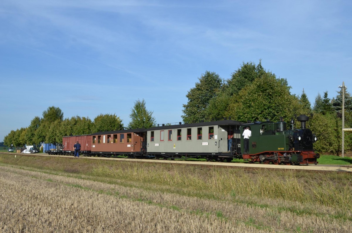 Döllnitzbahn: Sä. IK Nr. 54 mit PmG in Naundorf (bei Oschatz) zum „130 Jahre Schmalspurbahnstrecke Oschatz – Mügeln Jubiläum“ 13.09.2015 Dieter Berger