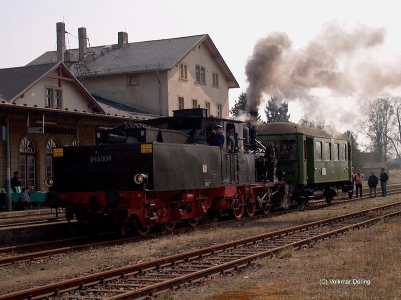 Einziger erhaltener Aussichtswagen der ehemaligen Windbergbahn (Freital - Dresden-Gittersee) hinter 89 6009 in Dürrröhrsdorf (Sonderfahrt 12. April 2003).