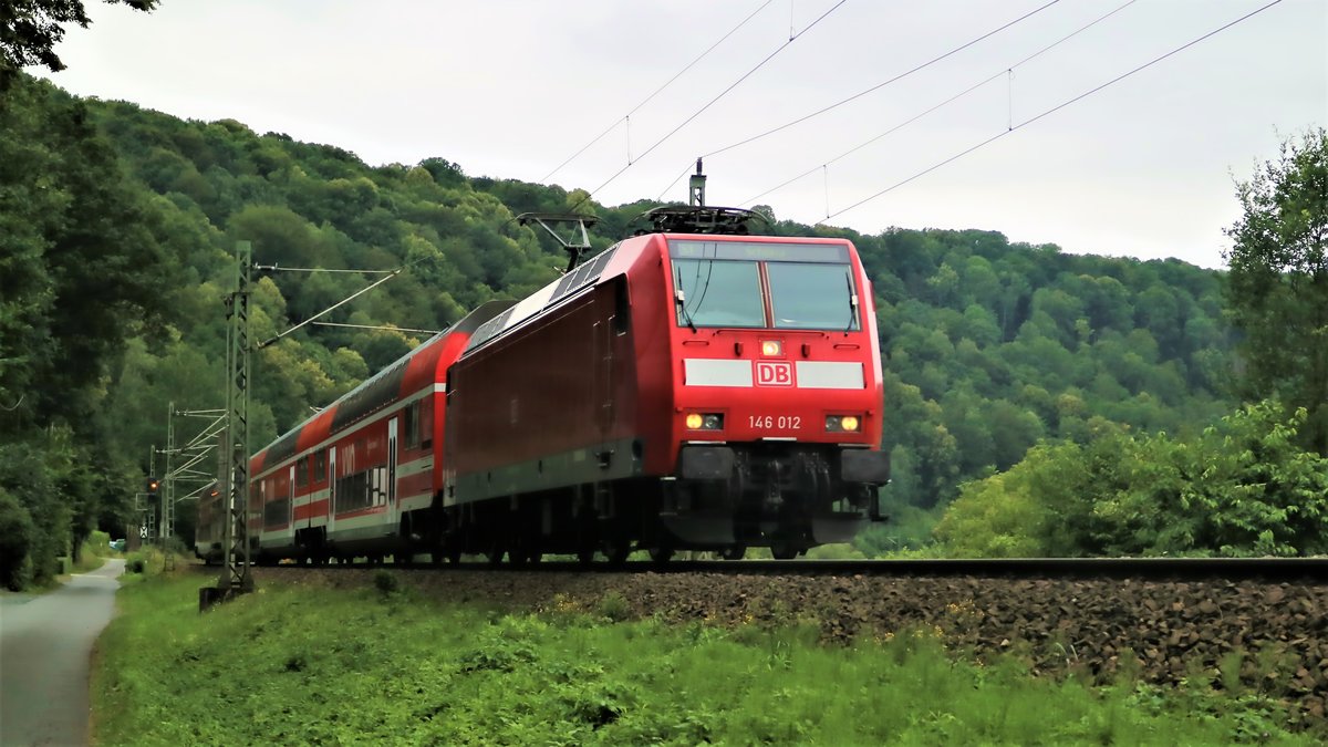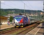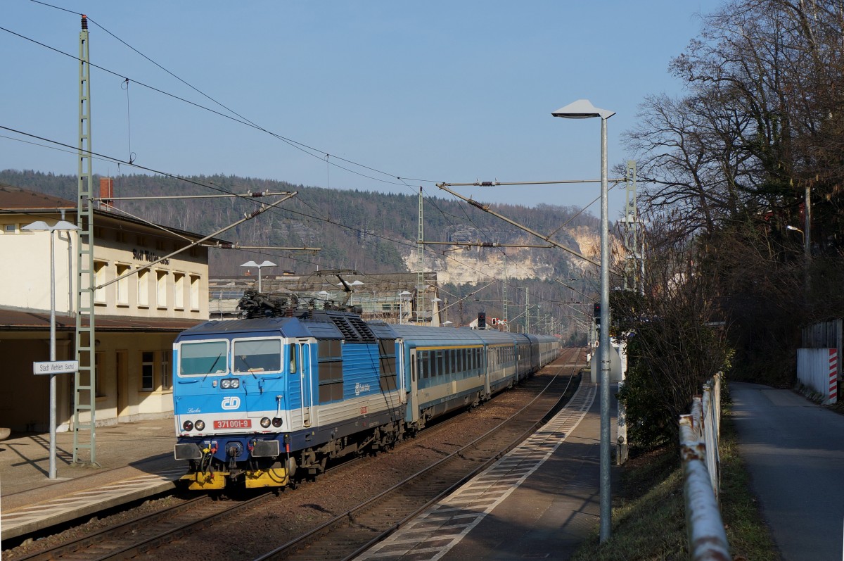 "Knödelpresse" CD 371 001 "Lucka" mit dem EC 174 nach Hamburg-Altona bei Durchfahrt durch Stadt Wehlen (Sächsische Schweiz); 09.03.2015