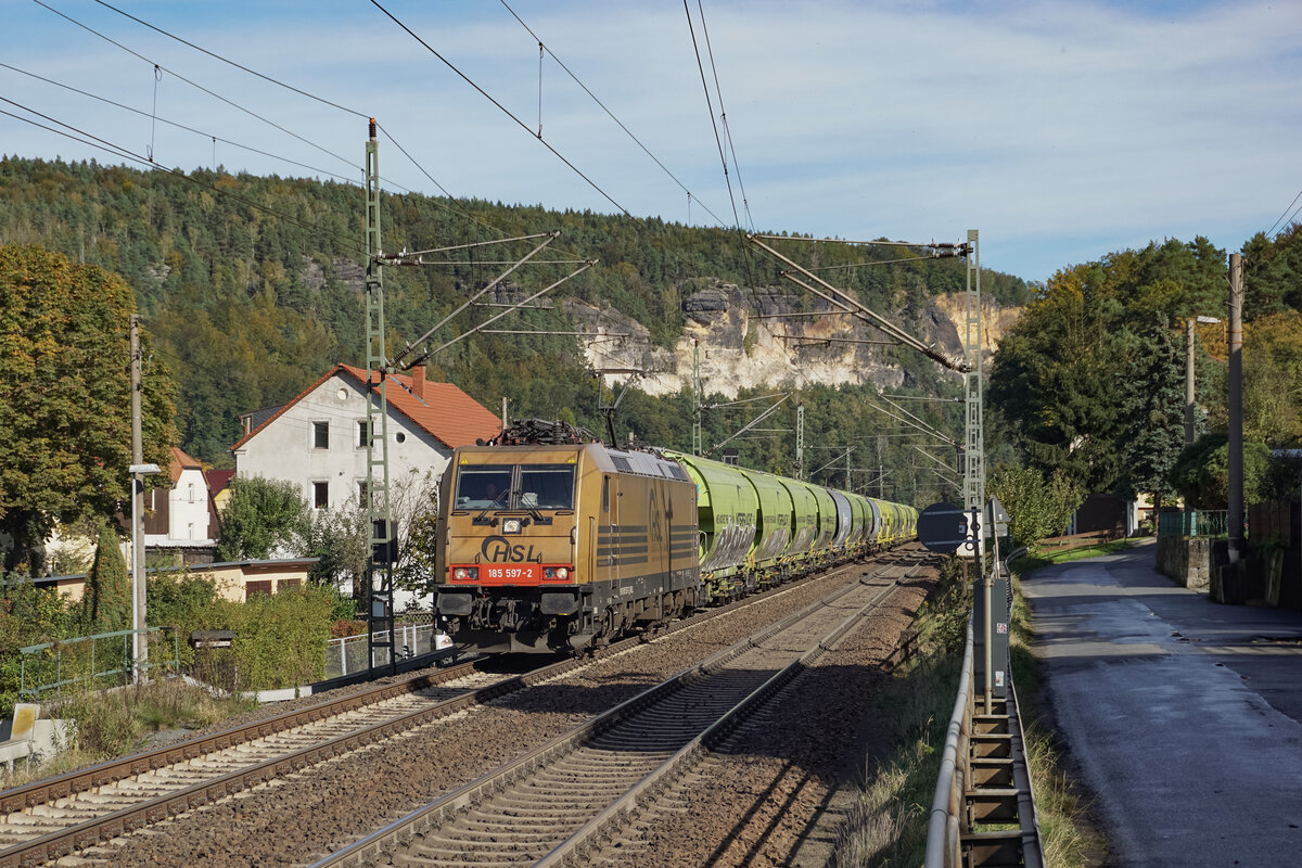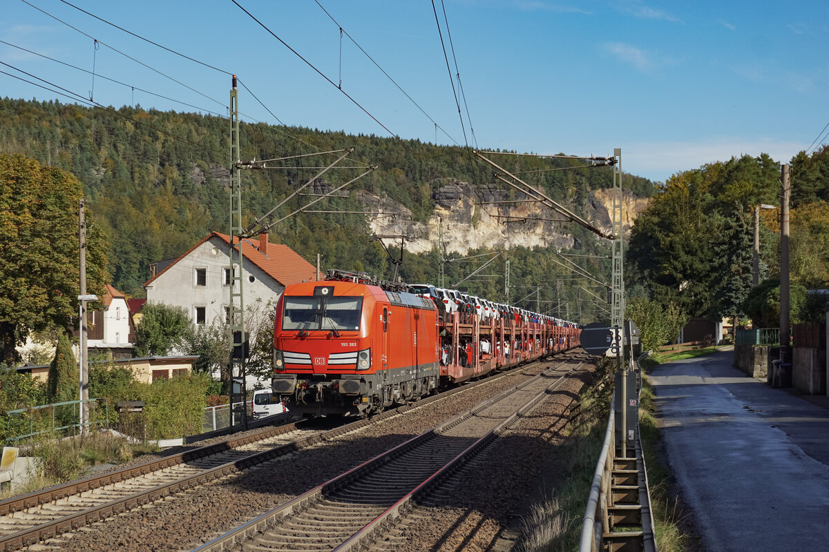 CD Cargo 372 008 fuhr mit einem Autozug nach Falkenberg(Elster) am 09.10.2024 durch das idyllische Örtchen Stadt Wehlen in der sächsischen Schweiz. Robin Kunze