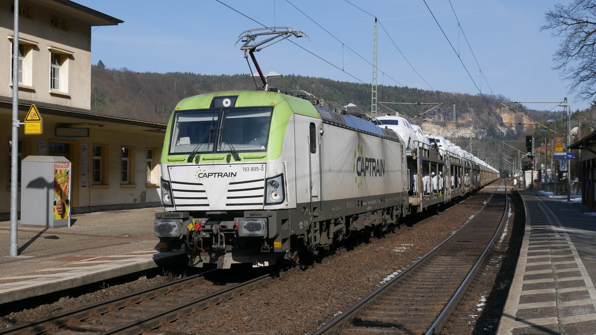 Vectron CAPTRAIN 193 895 mit einem Autotransportzug aus Tschechien kommend bei Durchfahrt durch Stadt Wehlen (Sächsische Schweiz); 19.03.2018