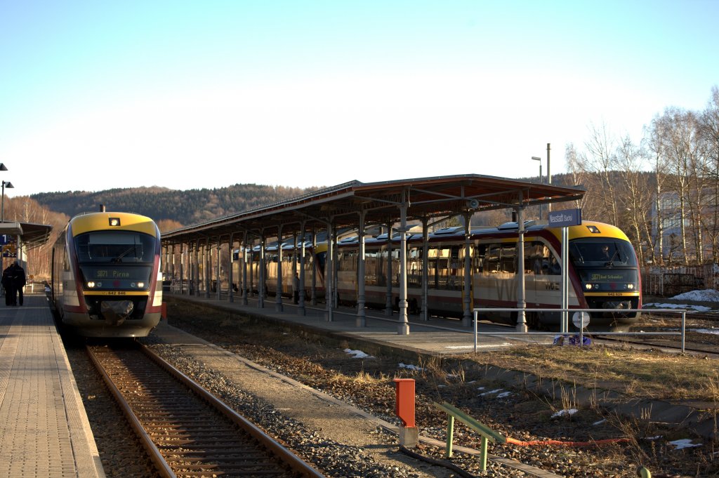 Hier ist links 642 846   Rose von Sebnitz  abfahrbereit Richtung Pirna, währendessen links 642 833 und 642 822 abfahrbereit nach Bad Schandau stehen.