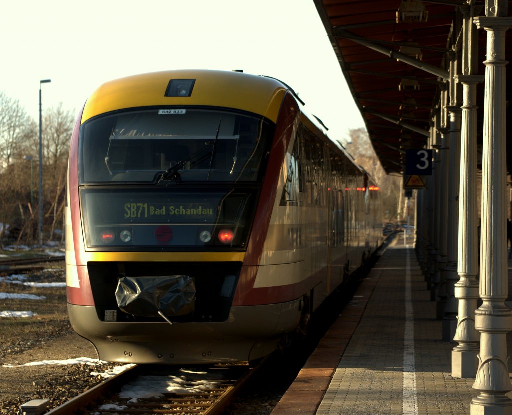 An diesem schönen Dezembertag waren auf der Wanderung einige "Desirios" anzutreffen. Hier steht 642 833 nachlaufend , 642 822 führend zur Abfahrt nach Bad Schandau gegen 14:00 Uhr am 28.12.2012 in Neustadt (Sachsen) bereit.