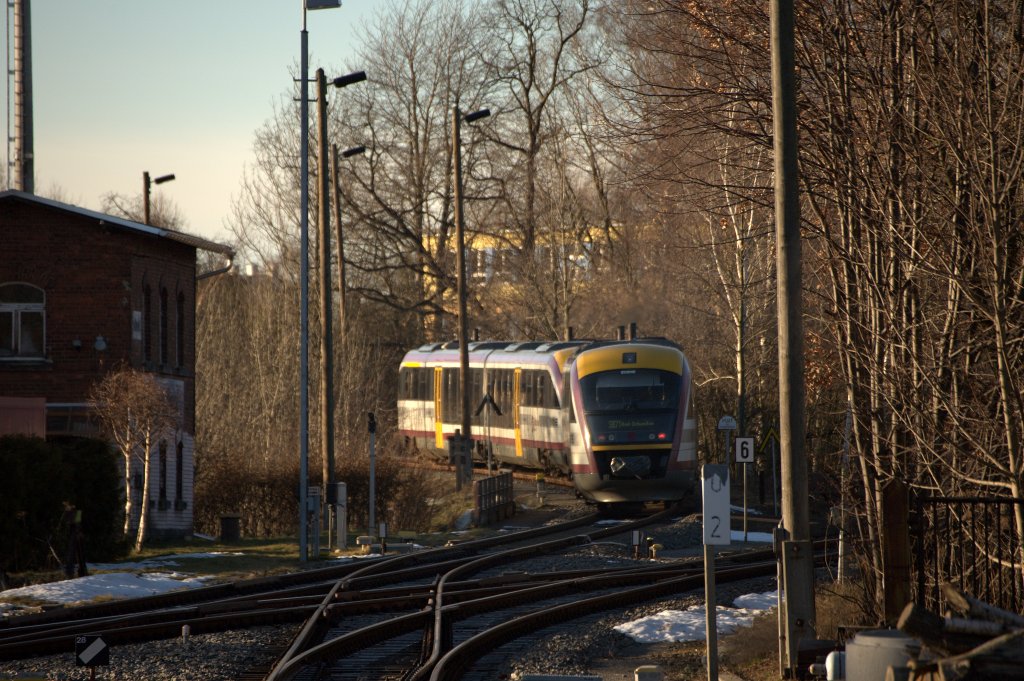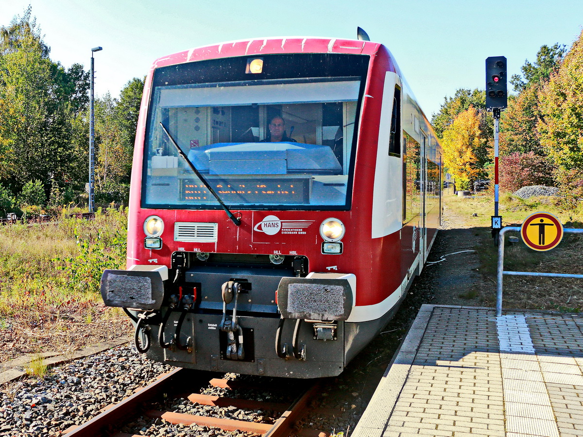 Die Hanseatische Eisenbahn ist auch in Sachsen aktiv. Der HANS-Triebwagen 650.06 faährt am 10. Oktober in den Bahnhof Neustadt (Sachs) ein.