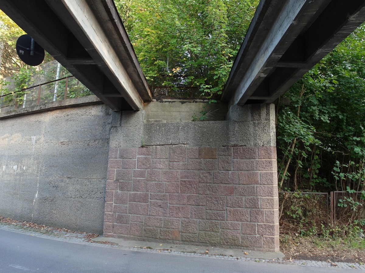 Die Bahnbrücke (Saubachtalbrücke) über die Parkstraße der ehemaligen Strecken Freital-Potschappel - Nossen und Wilsdruff - Meissen-Triebischtal war zweigleisig und macht eigentlich noch einen recht guten Eindruck; letzter Zugbetrieb war 1972; Foto vom 02.10.2014