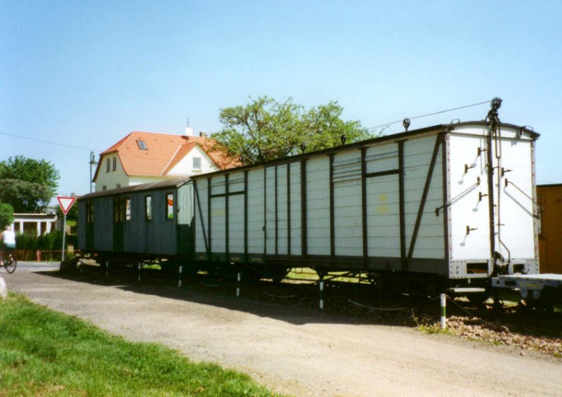 Ein sächsischer Bahnpostwagen der Gattung IIb und ein Gedeckter Güterwagen GGw waren am 20.05.02 auf dem Gelände des Haltepuktes Wilsdruff anzutreffen. Der hier ansässige Verein kümmert sich mühevoll und in jahrelanger Kleinarbeit um den Bestand der Zeitzeugen aus der Zeit des Wilsdruffer Netzes.
