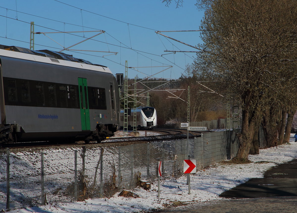 Zementzug von Regensburg Ost nach Berlin Rüdersdorf mit der 2159 235. Aufgenommen am 29.01.2025 in Jößnitz am Haltepunkt. Zusehen auch eine Vogtlandbahn der Baureihe 650