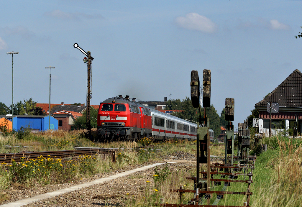 218 117-0 und eine Schwesterlokomotive passieren am 5.08.2009 mit dem vormittäglichen IC Richtung Hamburg das ASig von Meldorf. Wer genau hinschaut, erkennt zwischen den Gewichten auch das Stellwerk Mf (Erbaut 1940) und das dazugehörige ASig. Das Häuschen im Vordergrund nennt sich Ms und ist 1959 in Betrieb gegangen. Julian Düll